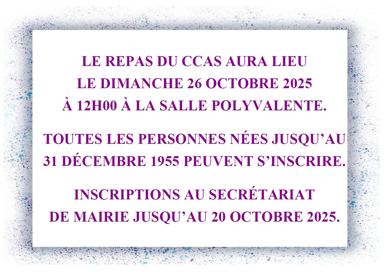 Le repas du CCAS aura lieu le dimanche 26 octobre 2025 à 12h00 à la salle polyvalente.
