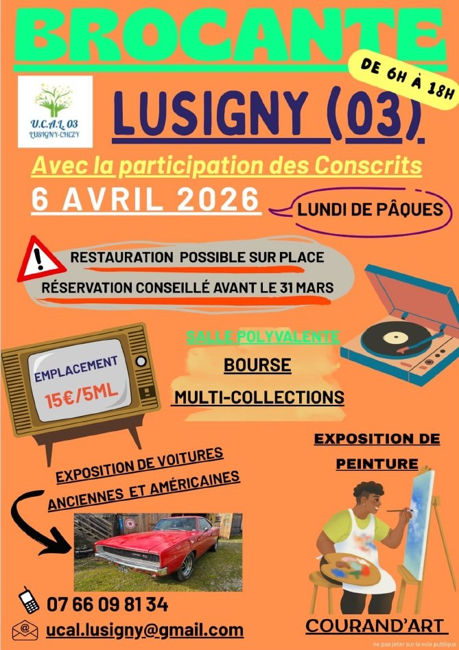Pour les exposants, renseignements et réservations avant le 31 mars au 07.66.09.81.34 ou par mail : ucal.lusigny@gmail.com